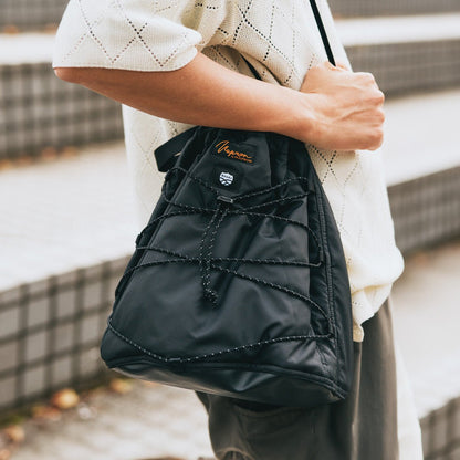 オールブラックのシックな見た目の中にアクセントを効かせたディテールが、カジュアルスタイルから大人コーデまで、どんなスタイルにマッチし、幅広い場面で活躍するバッグです。
