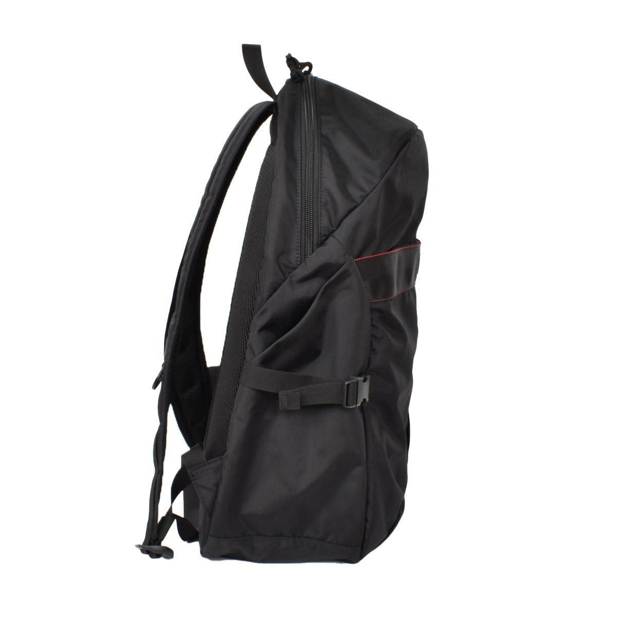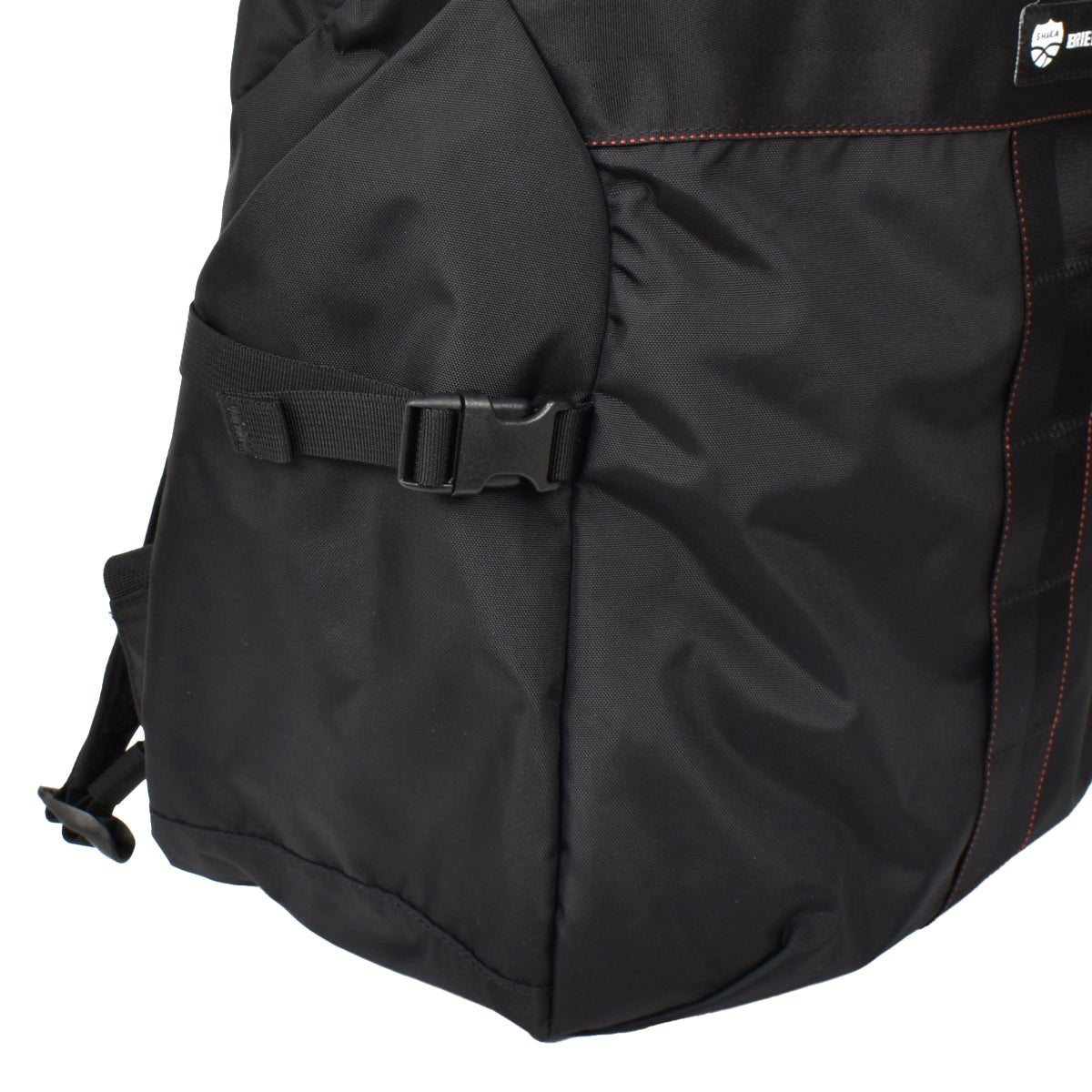 サイドにはボリューム調整と、旅先で薄手のカーディガンやシャツ程度であれば脱いだ際に引っかけて両手を開けられるようベルトを配し、ボトルや折り畳み傘を収納できるサイドポケットを完備しています。