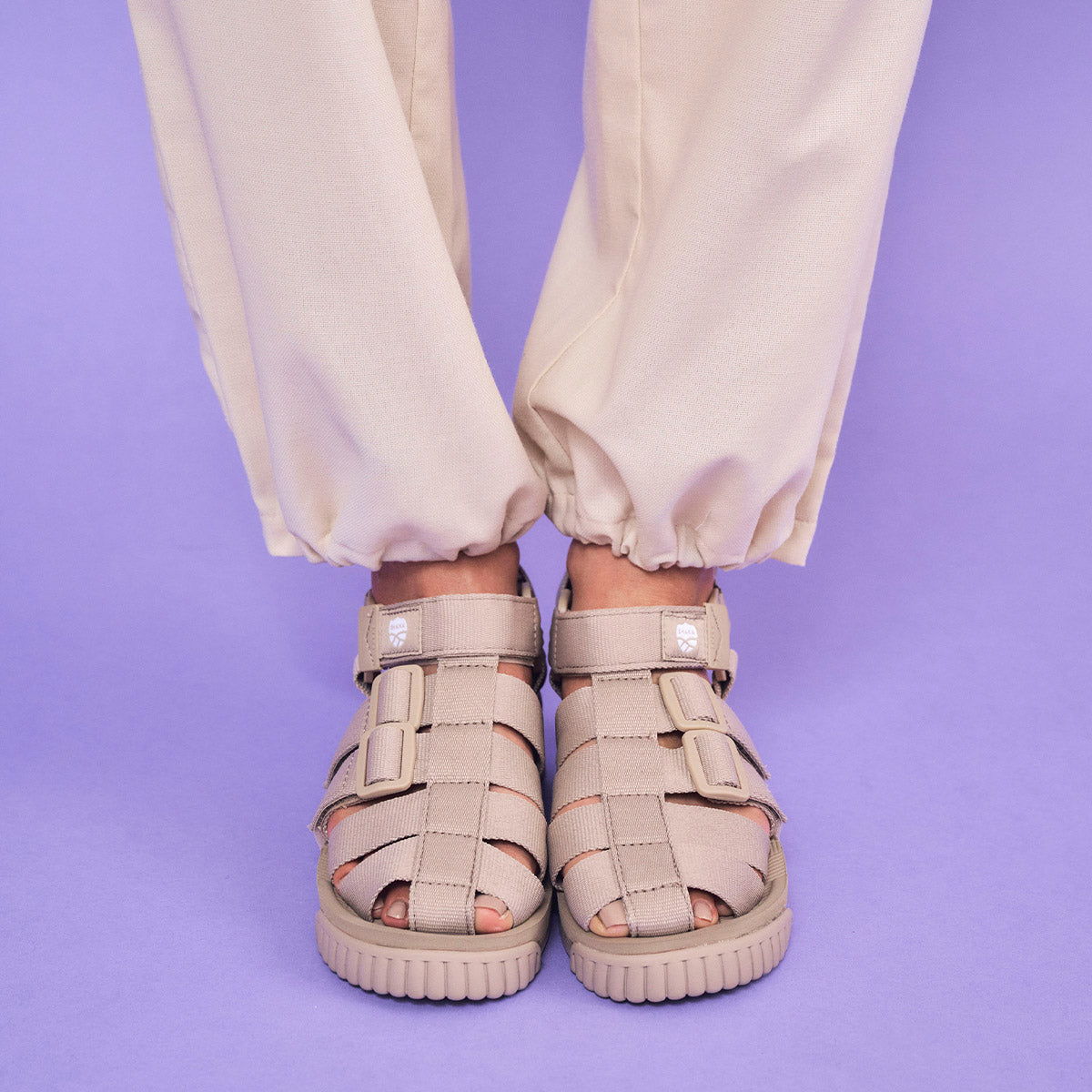 見た目にもポイントになる編み込み状のアッパーは、テープの質感にもこだわりがあります。2023年春夏からサステナブルを配慮した再生素材のポリエステル製ストラップを使用し、強度と足当たりの良さを両立するベストなバランスを追求し、コットンライクな風合いでナチュラルなルックスに仕上げました。