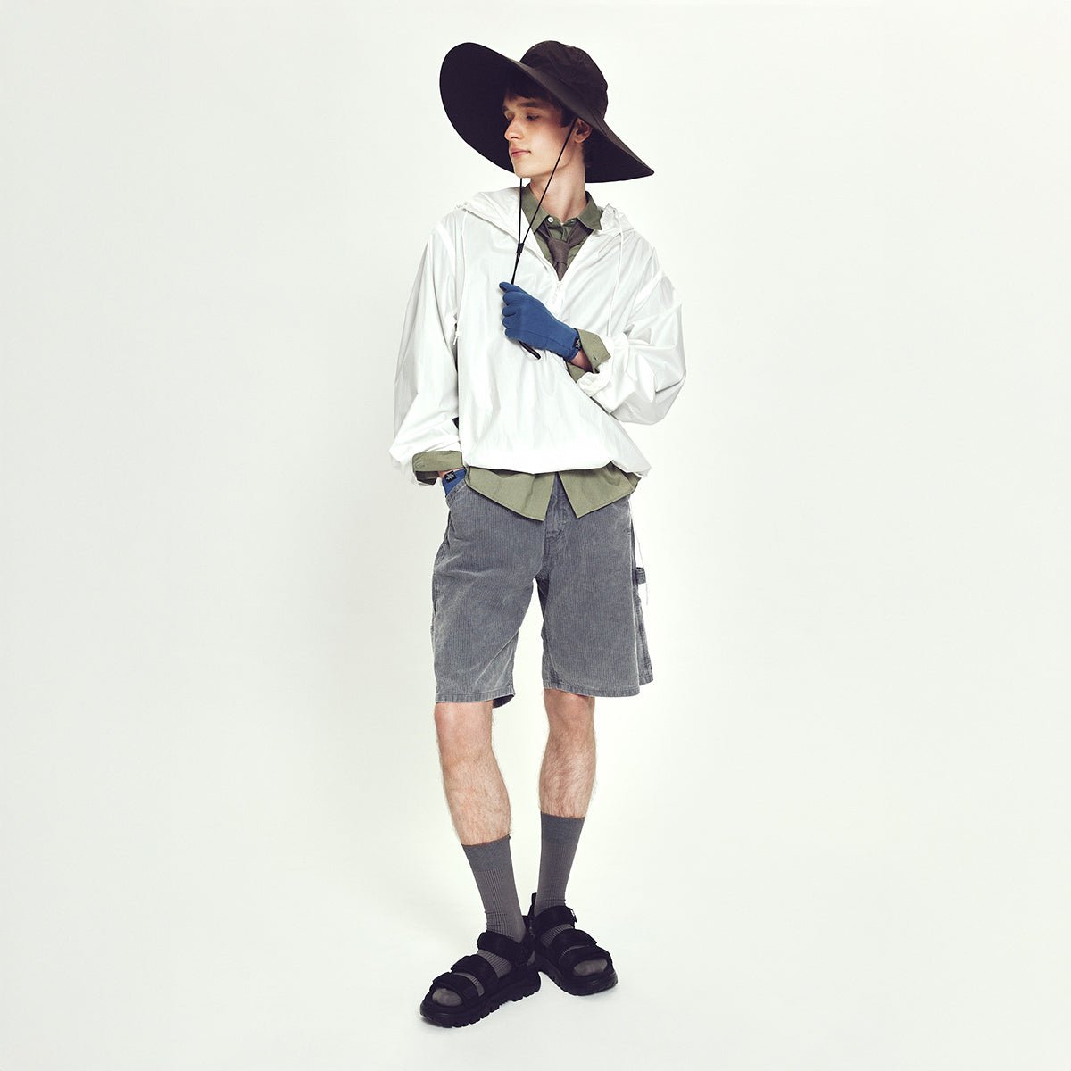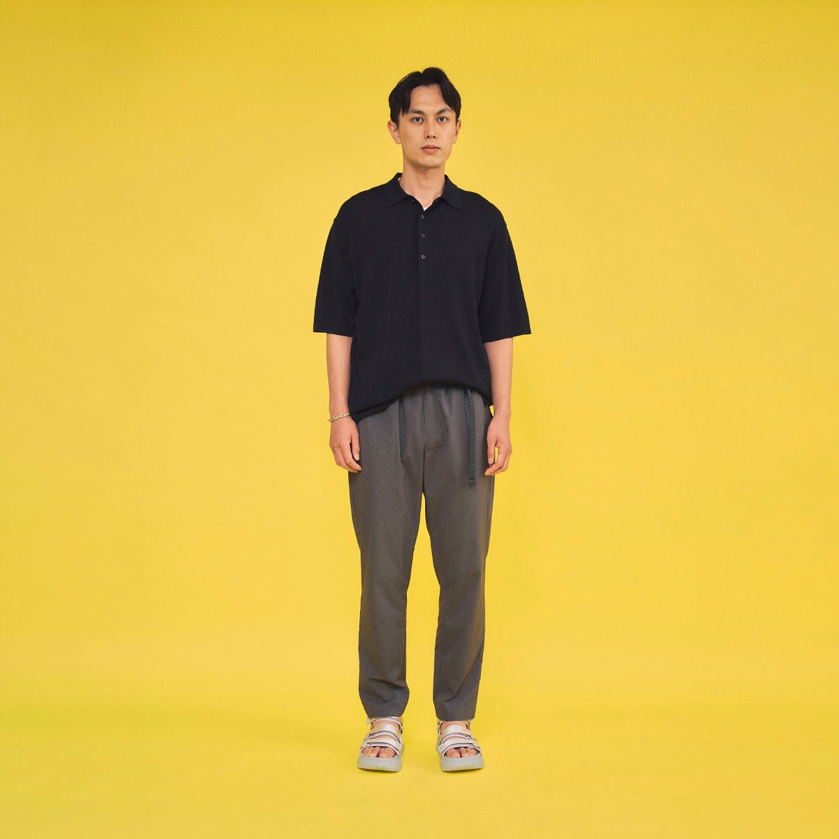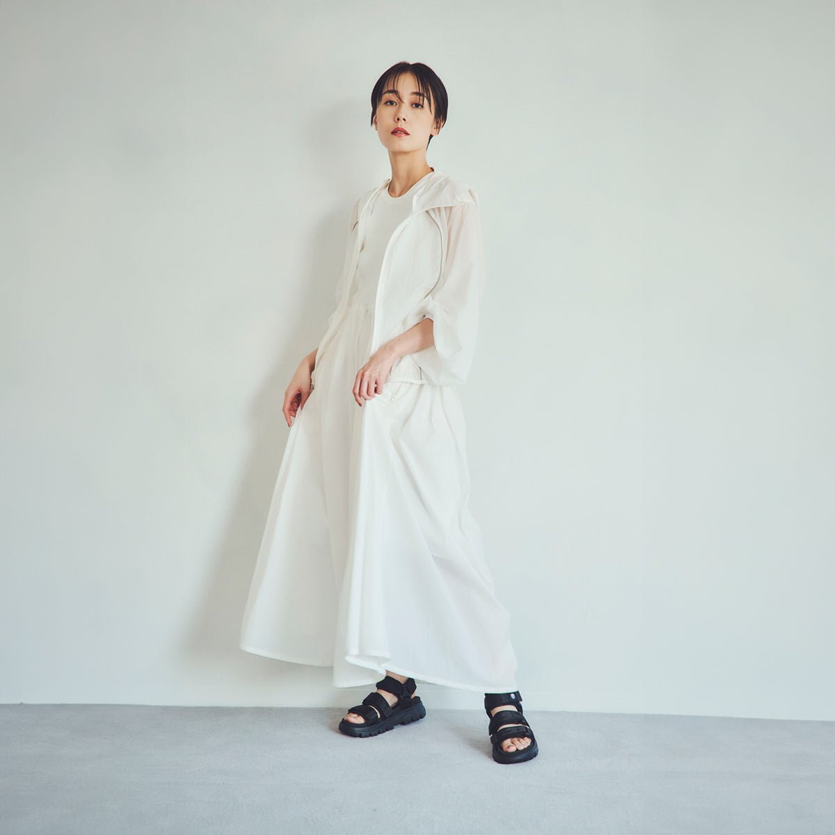 スポーティーなテック系のウェアやジャージ素材のアイテムとの相性も抜群。夏はシンプルなTシャツやノースリーブ、レギンスレイヤードで軽快に。SHAKA(シャカ)のスポーツサンダルで動きやすさとおしゃれを両立。