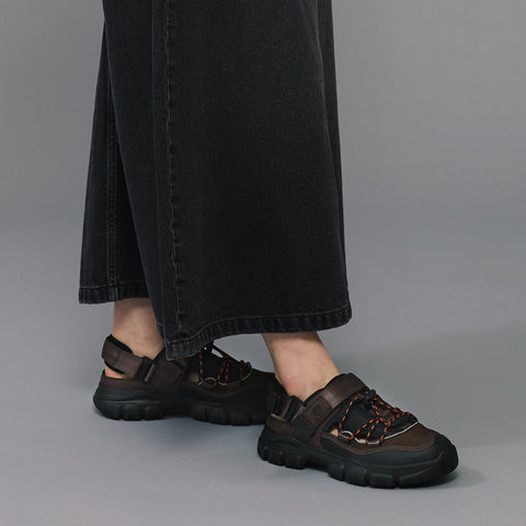スポーティー&アウトドアテイストのスニーカーライクなコードと甲&ヒールのベルクロで簡単にフィット感の調節が可能になっています。