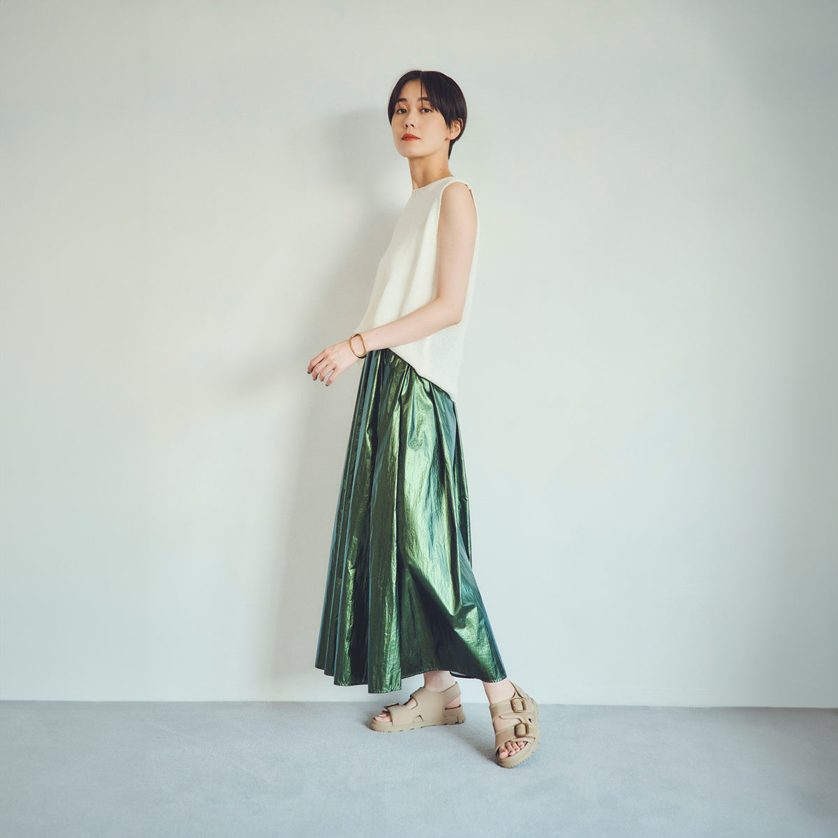 シンプルなワントーンデザインでキレイめスタイルにもマッチ。スラックスやチノパン、スカートや上品ワンピースとも相性抜群です。ゴールド&シルバーのメタル系アクセサリーやかごバッグ、レザーグッズで合わせればより大人な印象に。