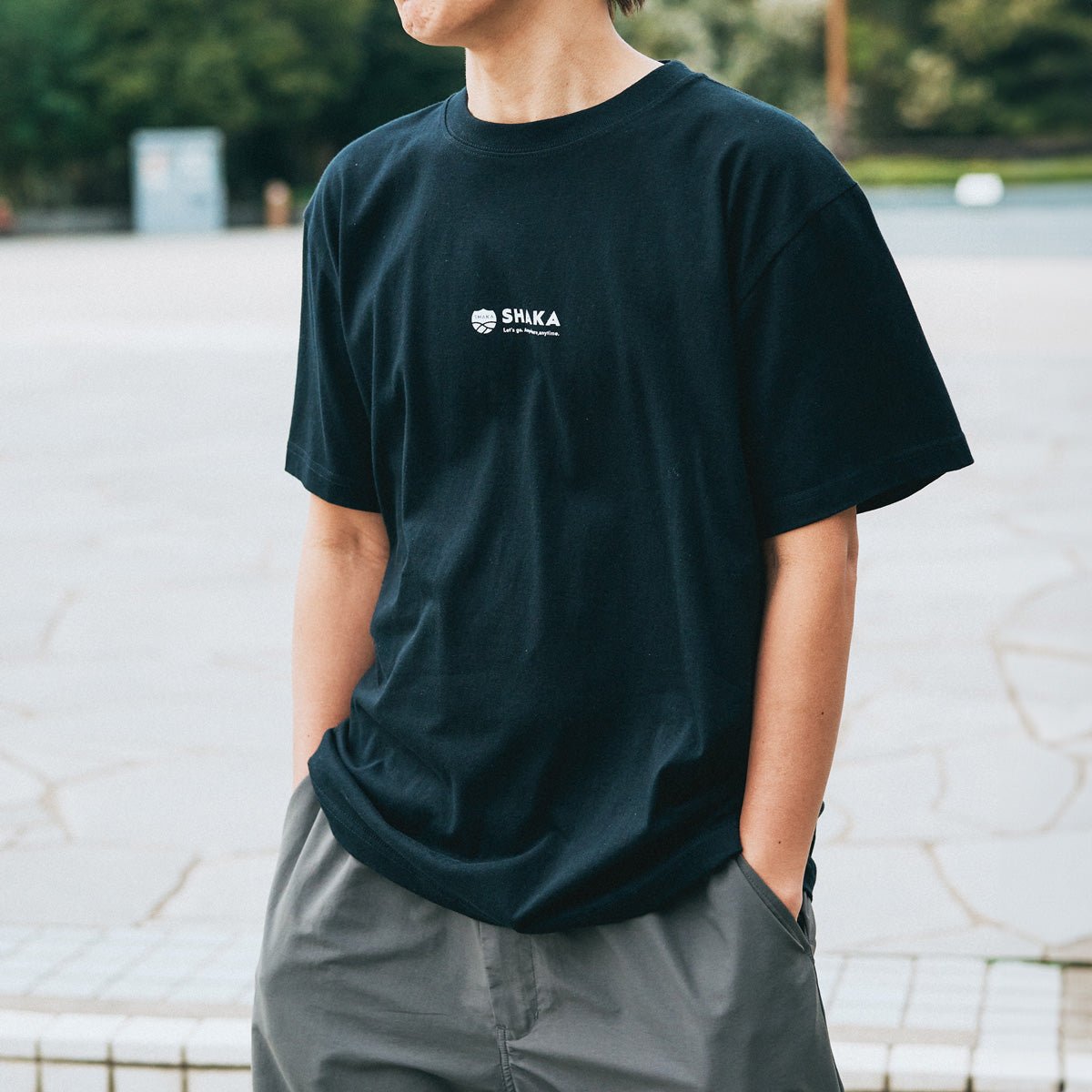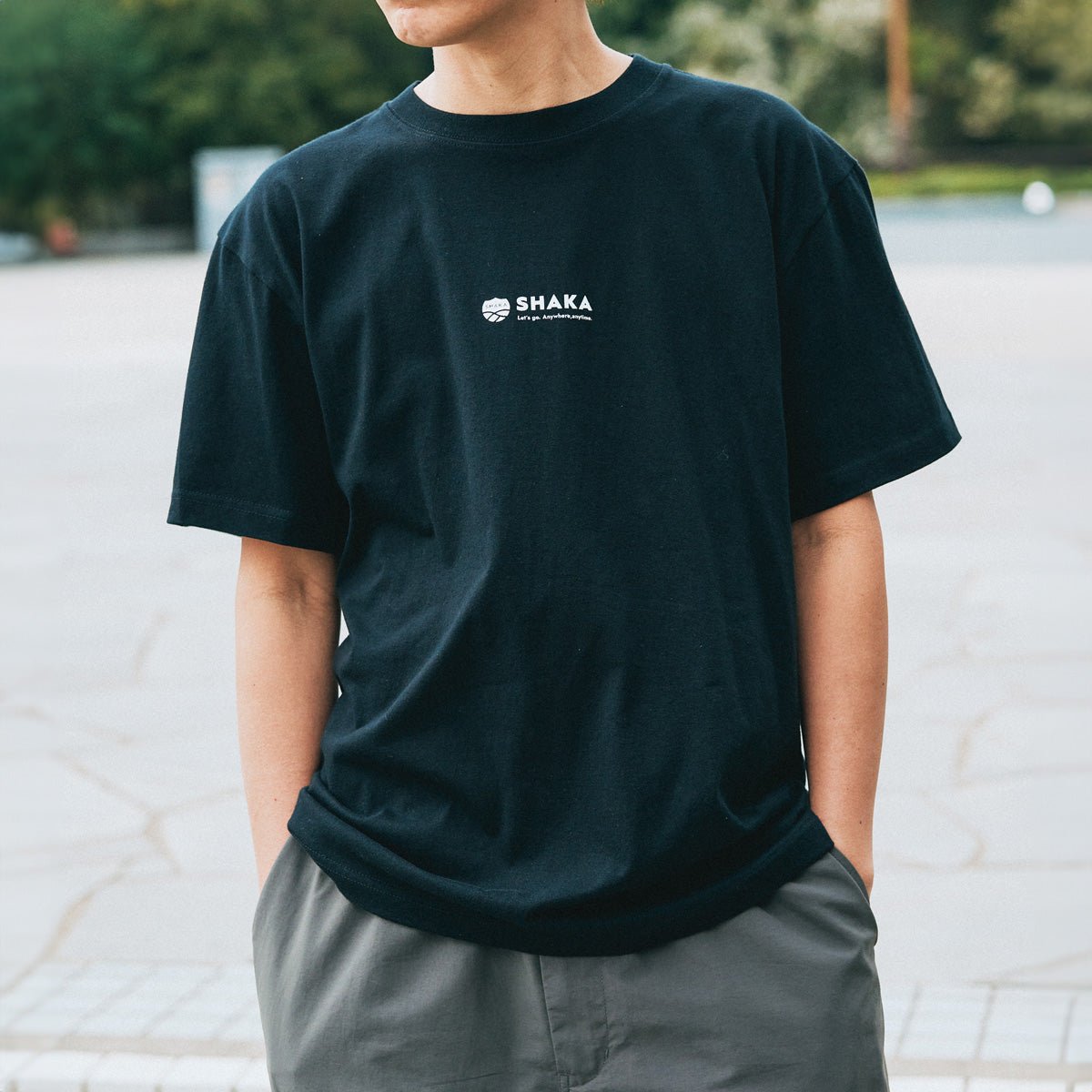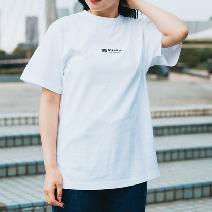 SHAKA(シャカ)のステートメントを表現したロゴを胸元にプリントしたベーシックな半袖Tシャツ。